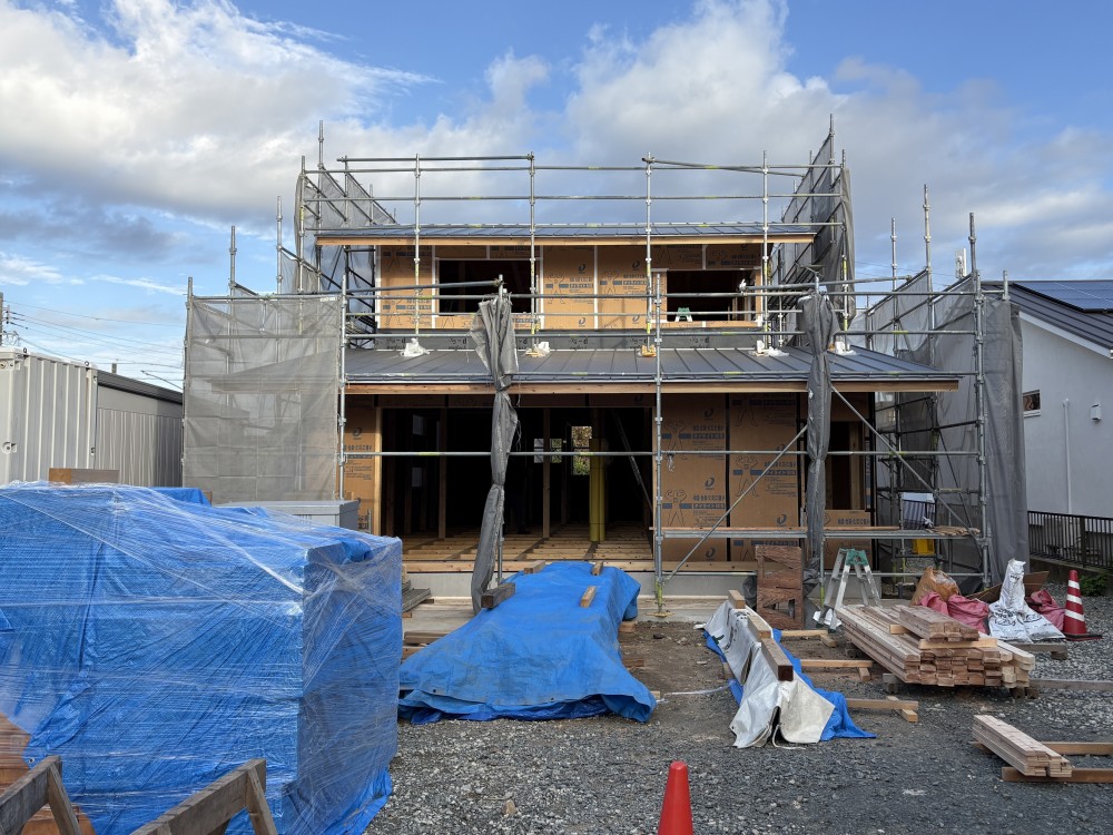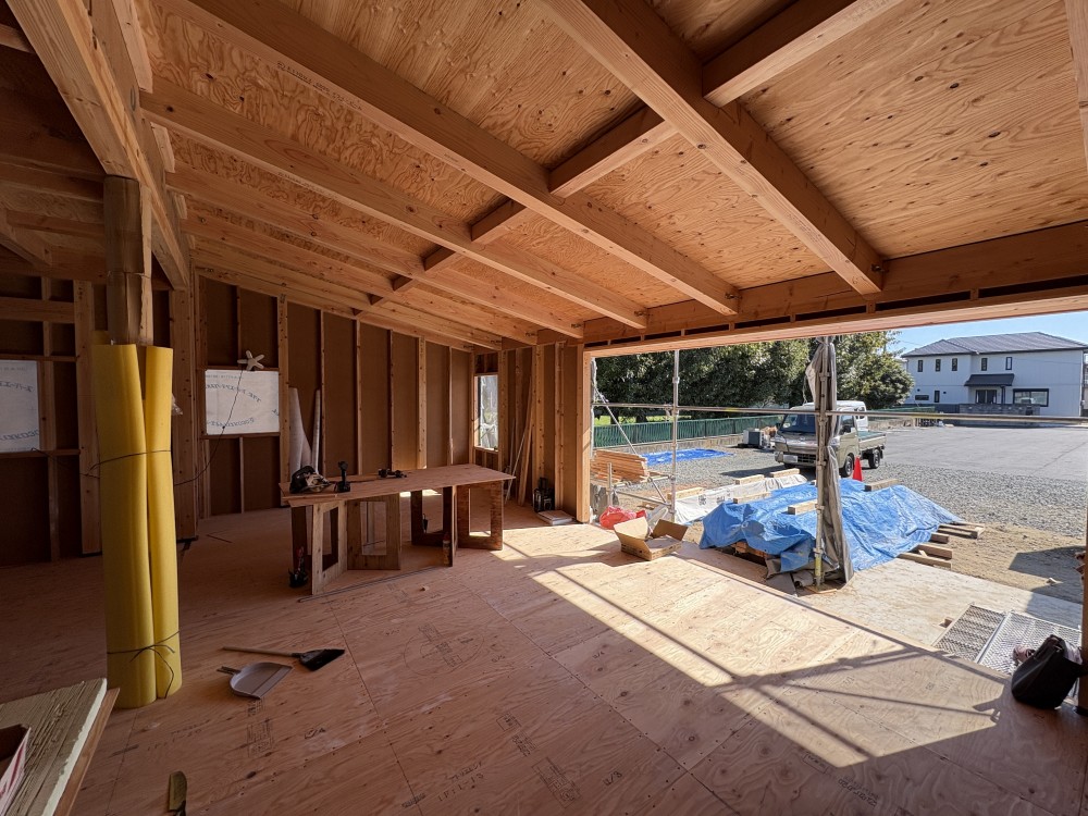 外部に置いてある1階床合板材の両面、間柱、筋交い材なども一本一本丁寧に施工します。