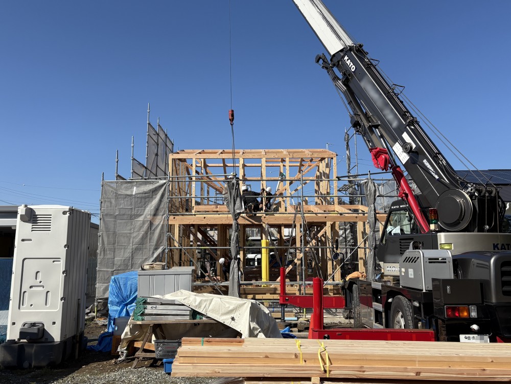 骨組みが出来上がると、図面で見るより、体感として空間をつかむ事や窓からの景色を確認し完成がイメージしやすくなります。